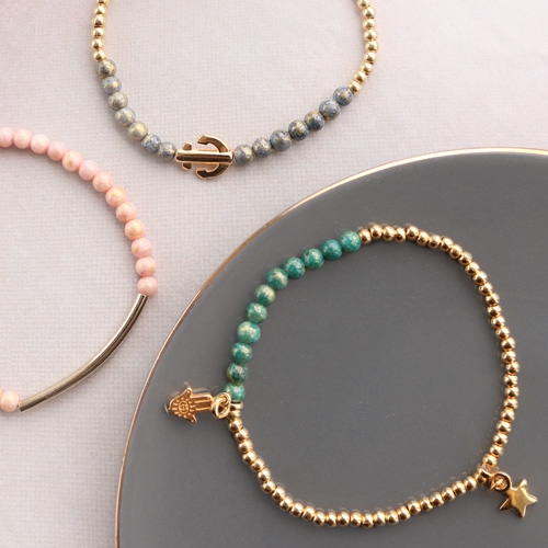 Nous avons réalisé des créations de bijoux subtiles avec ces nouvelles pierres naturelles en jade. Découvrez nos créations de bracelets en petites perles de 4mm et des boucles d’oreilles originales. Nous avons combiné les pierres naturelles avec des perles et breloques en métal DQ doré qui se marient très bien entre-elles.