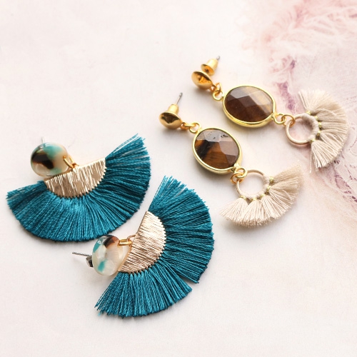 Besoin d’inspiration pour faire des boucles d’oreilles tendance ? Découvrez vite nos nouvelles créations ! Nous avons fabriqué des boucles d’oreilles à franges avec des pompons colorés, du métal DQ et des connecteurs en pierres semi-précieuses. Quelle est votre paire de boucles d’oreilles préférée ?