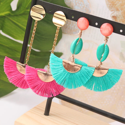 Boucles d’oreilles colorées avec pompons, perles coquillage cauri et métal DQ