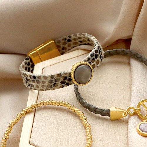 Avec ces chouettes articles, vous pouvez facilement créer des bracelets élégants. Utilisez par exemple du cuir DQ et de jolies perles DQ pour faire un bracelet double. Cachez les extrémités dans des embouts et attachez une chaîne d’extension à votre fermoir. Ou bien collez un cabochon dans une sertie et glissez celle-ci sur le cuir serpent. Vous pouvez vous servir du même cuir pour créer un cordon de téléphone tendance.
