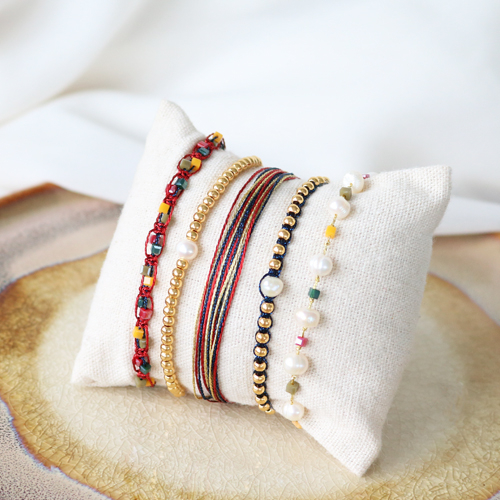 On adore les bracelets en macramé ! Ces bracelets sont très faciles à faire soi-même et on peut les porter avec tous nos autres bijoux et accessoires. Nous avons fabriqué plusieurs types de bracelets avec les nouveaux fils macramé. Vous trouverez des bracelets intemporels ainsi que des bracelets festifs. Nous avons combiné le nouveau fil macramé métallisé avec des perles d’eau douce et du métal DQ que vous trouverez également dans notre gamme. L’apparence classique des perles d'eau douce apporta un beau contraste.