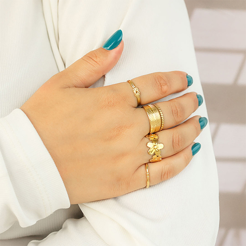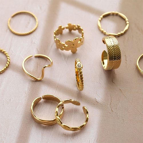 Nouveau ! Fascinante collection de bagues en acier inoxydable avec une grande variété de motifs, dont des fleurs et des cœurs . Toutes les bagues sont disponibles en doré et en argenté et sont ajustables. Une très belle série à ajouter à votre collection de bijoux!