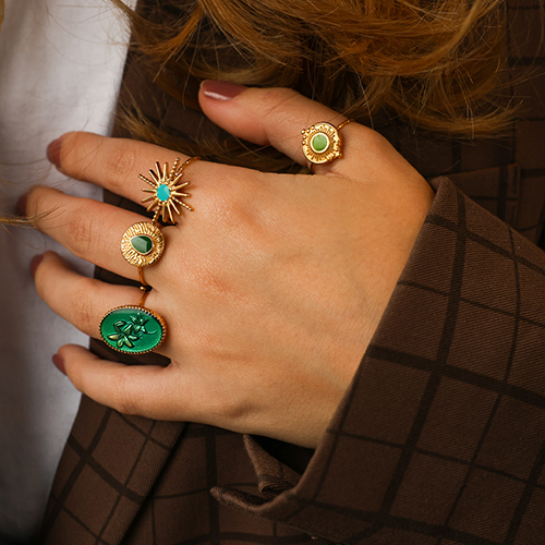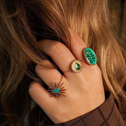 • Bagues en acier inox émaillées rond avec goutte Doré-vert fonce