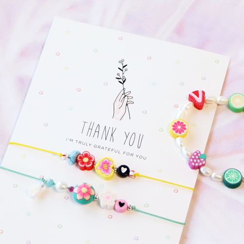 Les nouvelles perles en polymère sont parfaites pour la confection de bijoux cool et fun. Les perles peuvent être combinées à l’infini avec de nombreuses perles et matériaux d’enfilage différents. Pour les bracelets, nous avons choisi du fil macramé. Nous y avons ensuite enfilé une combinaison de perles en polymère, de perles acryliques, de perles chips et d’un pompon. Vous voulez que tout cela reste bien en place ? Faites simplement un nœud aux deux extrémités. Créez de jolis anneaux assortis en alternant des perles en polymère et des perles de rocailles sur du fil de nylon. Vous pouvez également utiliser les perles en polymère pour confectionner un ravissant cordon de lunettes de soleil en enfilant différentes perles sur du fil de nylon. Attachez l’extrémité du fil aux extrémités du cordon de lunettes avec une perle à écraser et votre accessoire de lunettes tout en couleur est prêt ! Que le soleil se montre.