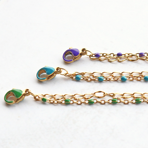 Confectionner des bijoux de qualité, au look élégant et une subtile touche de couleur ? Alors, lancez-vous avec les nouveaux jaseron et fermoirs mousqueton en acier inox aux détails délicieusement colorés à l’huile. Ces articles se coordonnent parfaitement et font les plus beaux bracelets et colliers. Assurez-vous de combiner le jaseron finement détaillé à l’huile avec une autre variante de jaseron pour un effet plus fantaisie. Vous pouvez les combiner en créant deux rangées pour votre bracelet ou votre collier. Vous attachez les deux rangées au même fermoir et le tour est joué. Vous pouvez également attacher une breloque en acier inox au fermoir ou accrocher plusieurs breloques au milieu du collier à l’aide d’un anneau brisé.