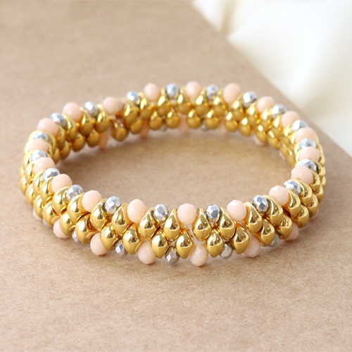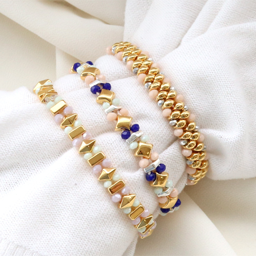 Nouveau chez Grossiste en Perles, les perles duo beads en métal DQ ! Mais que pouvez-vous confectionner avec ces perles ? Nous avons confectionné différents bracelets et bagues avec ces nouvelles perles. Vous pouvez simplement enfiler les duo beads sur un élastique. Choisissez les duo beads que vous souhaitez utiliser et choisissez également d’autres perles telles que les perles à facettes. Réfléchissez au modèle que vous voulez créer et allons-y ! Vous pouvez choisir d’utiliser les deux trous pour enfiler deux rangées de perles. Et pourquoi ne pas créer trois rangées pour faire s’entrelacer les perles en un motif super fun. Bien entendu, vous pouvez aussi choisir du fil macramé en complément de l’élastique.