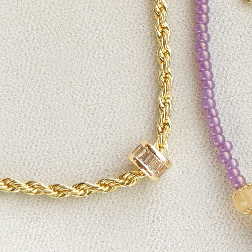 Ces petites breloques en zirconium sont superbes sur un collier en chaîne maille jaseron que vous pouvez utiliser comme collier ou comme chaîne de corps. Réalisez plusieurs colliers que vous pourrez porter ensemble, car ‘layering’ est toujours la tendance ! Créez par exemple un collier avec des pierres naturelles facettées et une perle en zirconium au milieu. Pour maintenir cette perle en place et cacher le trou d’enfilage, vous pouvez utiliser un embout de la collection bijoux C.U.S® message beads.