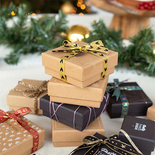 Créez une ambiance chaleureuse de Noël avec des emballages au design de Noël. Qu'il s'agisse d'élégantes boîtes, de sacs à bijoux ou de cartes à bijoux uniques, donnez à vos bijoux un message supplémentaire. Le bon emballage renforce le message destiné à la personne qui reçoit le bijou. L'emballage festif ajoutera certainement une touche supplémentaire de magie de Noël à votre collection !