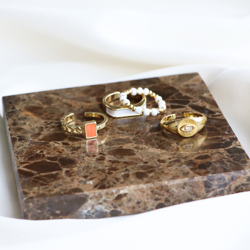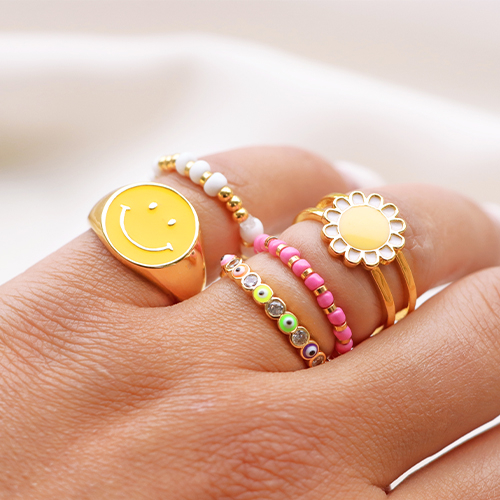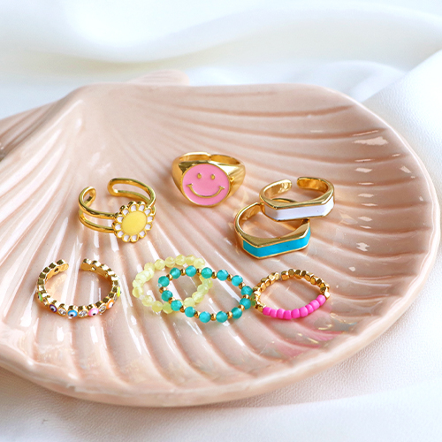 Ces bagues émaillées en laiton doré et argenté sont super fun à porter avec des bagues faites maison. Concevez votre propre bague en combinant par exemple des perles de rocailles, des perles à facettes et des perles en métal DQ. Enfilez-les sur un fil de nylon ou élastique et terminez la bague par un nœud et une goutte de colle. Utilisez un tapis pour perles lorsque vous travaillez avec des petites perles.