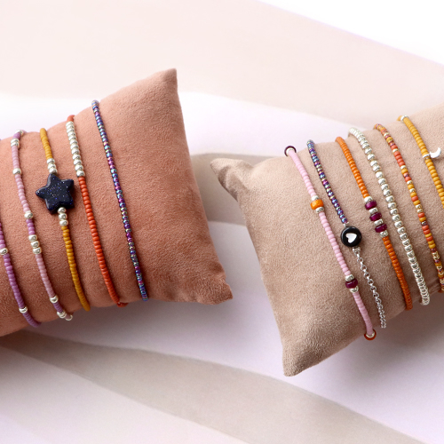 A la recherche d’inspiration pour votre collection de bracelets de la saison suivante? Ces petites perles de rocailles Miyuki dans des tons chauds vous seront très utiles. Vous pouvez utiliser du fil métallique et fermer le bracelet avec un joli fermoir ou bien utiliser du fil élastique. Alternez les perles avec des perles dorées et argentées ou accrochez une jolie breloque à votre création. Si vous vous servez d’un fermoir, nous vous conseillons de mettre une chaîne d’extension pour être sûr de pouvoir régler le bracelet à la bonne taille. Encore une astuce quand vous travaillez avec ces petites perles: munissez-vous d’un tapis de perlage pour éviter que les perles tombent.