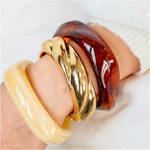 Nos best-sellers sont de retour ! Ces nouveaux bracelets en résine sont disponibles dans de nouvelles formes et aux couleurs chaudes. Ils sont audacieux, colorés, et très tendance. Associez-les à nos bracelets en métal pour votre “arm party” personnalisé !