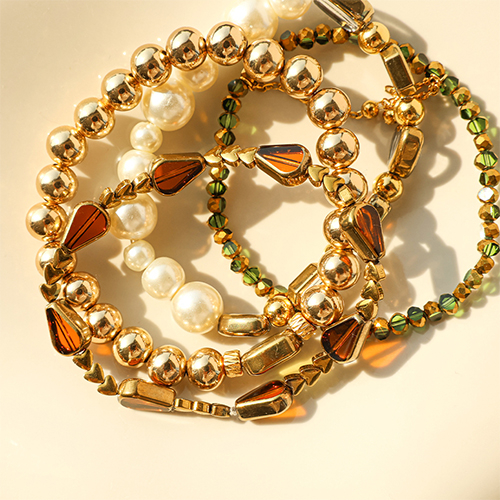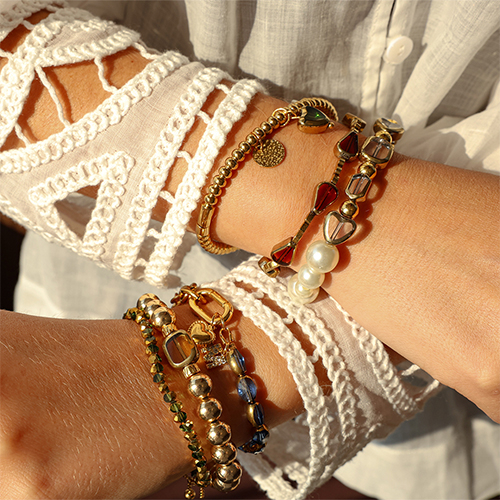 Cette nouvelle série de perles en verre est ornée d'une subtile bordure dorée et se décline en différentes formes comme des cœurs, des cercles et des gouttes. Disponible dans des couleurs scintillantes comme le vert, le rouge et le bleu, elles sont parfaites pour créer des bracelets luxueux ou des pendentifs de sac élégants. Créez des combinaisons uniques avec nos accessoires dorés et argentés!