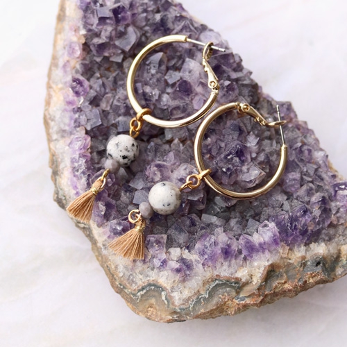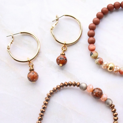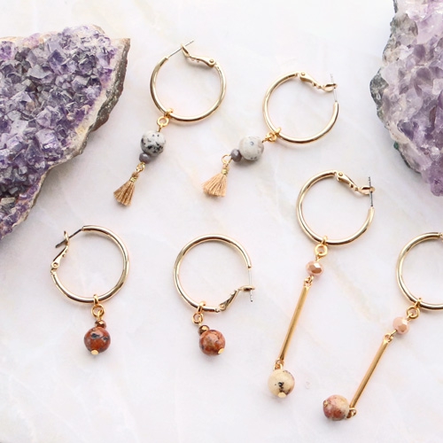 Succombez à la nouvelle collection de pierres naturelles à prix mini. Nous avons créé plusieurs bracelets et boucles d’oreilles avec ces magnifiques perles. Combinez les pierres naturelles avec des boucles d’oreilles et des connecteurs en métal DQ pour créer un beau contraste. Pour les bracelets nous avons combiné des perles en métal DQ avec des perles en pierre naturelle, des perles acryliques et des perles à facettes. Apportez une touche d’originalité à vos créations en ajoutant des plumes !