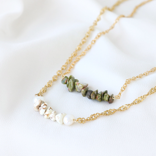 On adore ces magnifiques bijoux ! Quand on a reçu cette nouvelle série de perles Chips, on ne pouvait pas choisir quoi faire avec ; les possibilités sont infinies ! C'est pourquoi nous avons décidé de faire des parures avec des colliers, des bracelets et des boucles d’oreilles que vous pouvez combiner ou porter seul. Nous avons combiné les perles Chips en pierre avec des perles, breloques et apprêts en métal DQ, des perles de rocailles preciosa et des perles d'eau douce. Pour voir toutes les pièces utilisées, il vous suffit de faire défiler vers le bas.